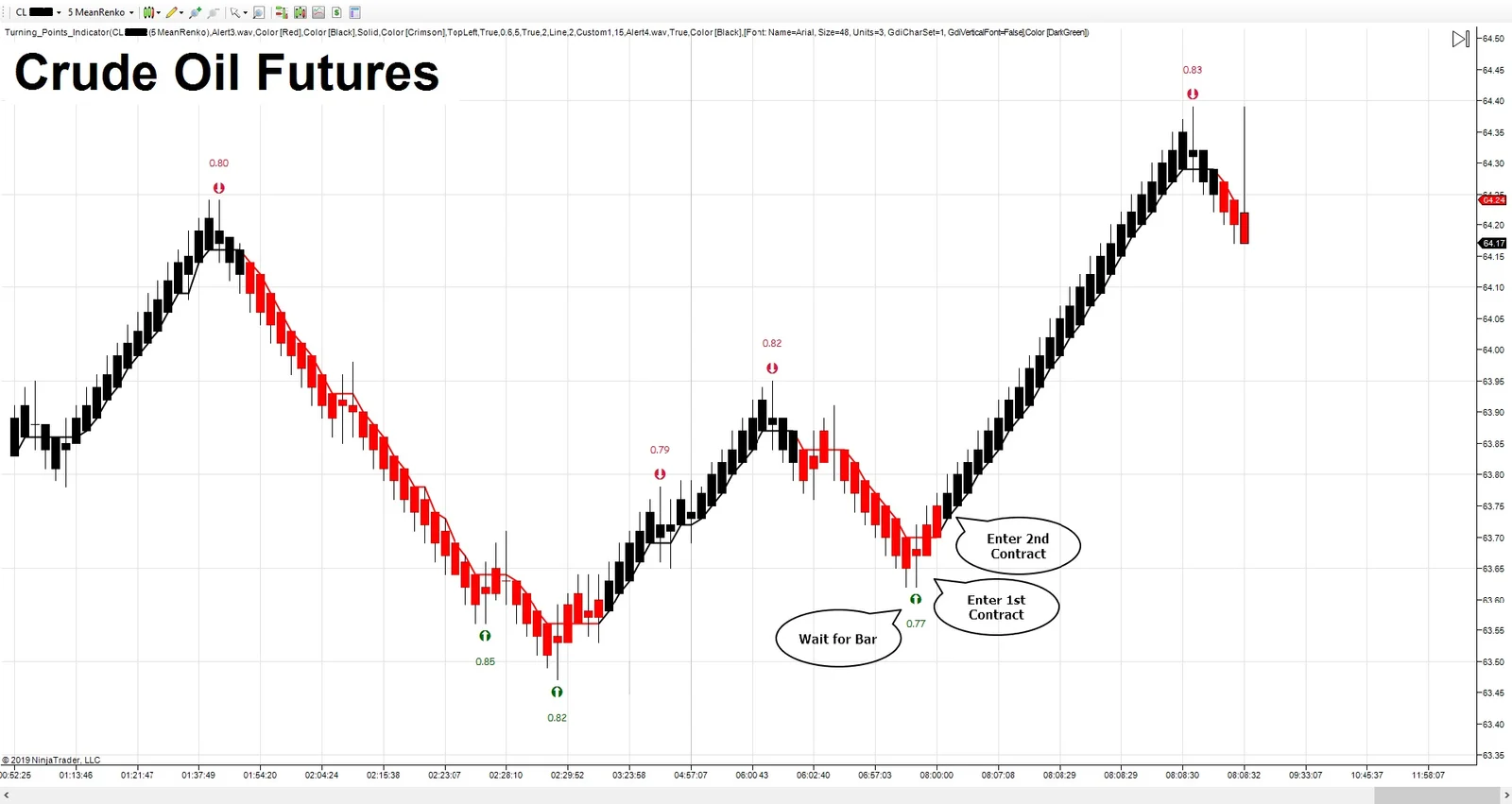 Aggressive Approach: Enter the first contract immediately after a trend-change bar appears. Add a second contract when the trend line changes from red to black.